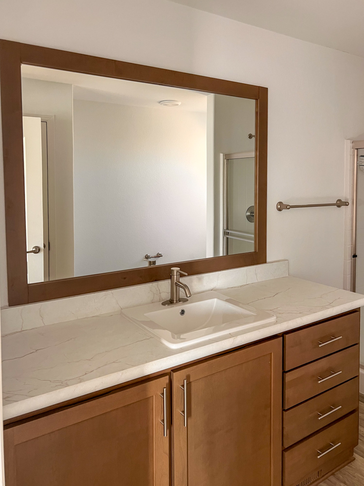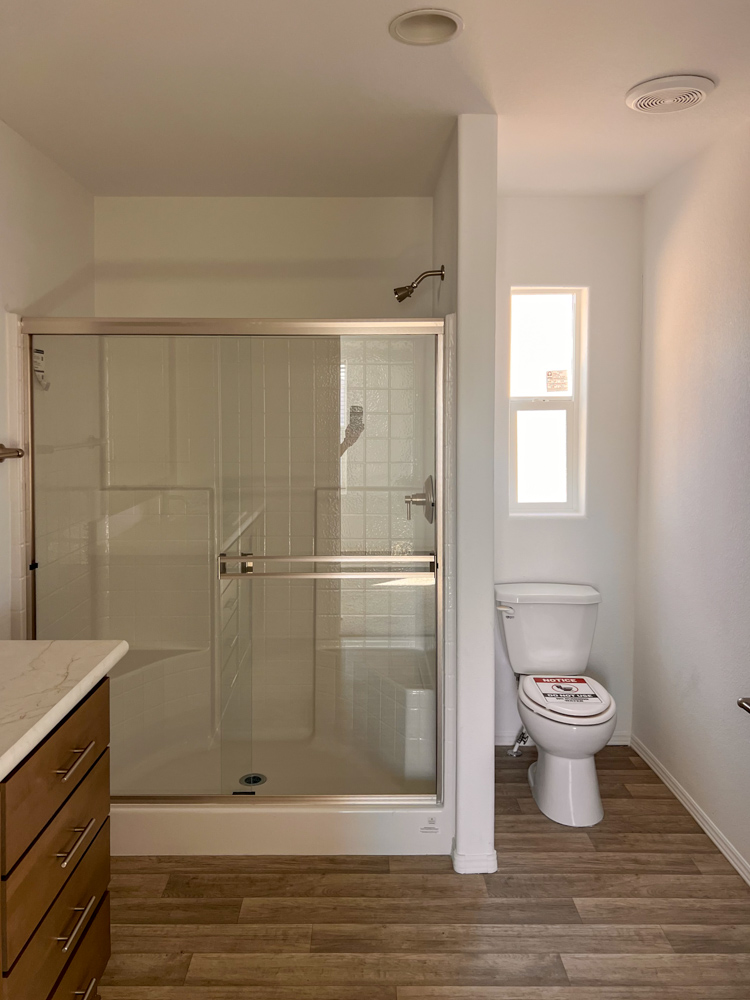 - Fiberglass Stall Shower w/ Glass Enclosure in Primary Bathroom
