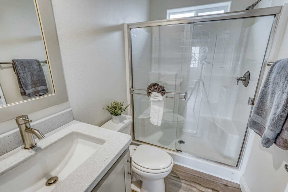 - Fiberglass Stall Shower w/ Glass Enclosure in Primary Bathroom