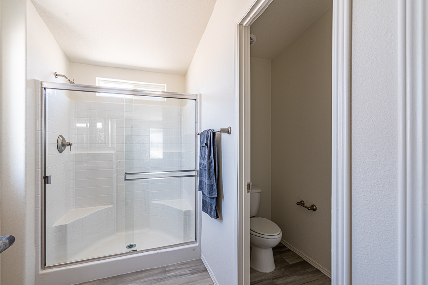 - Fiberglass Stall Shower w/ Glass Enclosure in Primary Bathroom